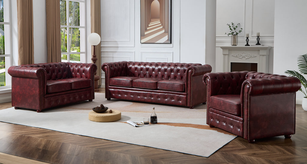 THE STYLISH TIMELESS OX RED CHESTERFIELD, THIS NEW MODEL MAKES A GREAT CENTRAL FOCUS FOR ANY CONTEMPORARY SITTING ROOM THIS ITEM COMES WITH SLEEK ARMS AND SMOOTH OX RED FAUX LEATHER EASY CLEAN LEATHER NOW ON OFFER ALL THIS MONTH WITH FREE DELIVERY